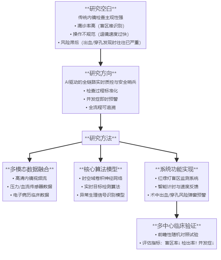 创新点: 开发能够实时监测内镜检查过程(如退镜速度、盲区提醒、出血风险预警)的AI系统,确保检查过程的标准化和安全性。