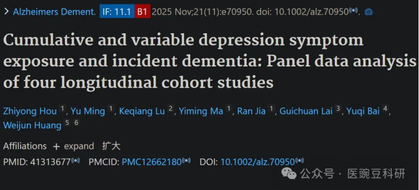 今天给大家介绍一篇发表于Alzheimer's & dementia : the journal of the Alzheimer's Association(中科院一区,IF: 11.1)的研究论文,“Cumulative and variable depression symptom exposure and incident dementia: Panel data analysis of four longitudinal cohort studies",该研究基于CHARLS+ELSA+HRS+SHARE数据库,调查了中老年人累积和变化的抑郁症状暴露与痴呆发病率之间的关联。