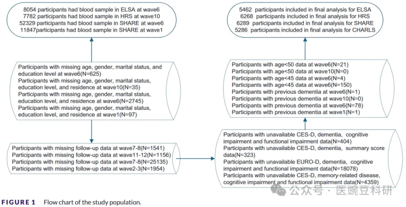 该研究包括来自四个基于人群的队列的基线血样的参与者:ELSA(第6波,N=8054)、HRS(第10波,N=7782)、SHARE(第6波,N=52, 329)和CHARLS(第1波,N=11, 847)。在每个队列中,我们依次排除了以下参与者:(1)缺失社会人口学信息;(2)年龄低于队列特异性阈值(ELSA和HRS<50岁;SHARE和CHARLS<45岁);(3)基线时的普遍痴呆;(4)后续两波失访;或(5)不完整的抑郁量表(CES-D)和欧洲抑郁量表(EURO-D)认知或功能评估。该过程产生了ELSA中5462名参与者、HRS中6268名参与者、SHARE中6289名参与者和CHARLS中5286名参与者的最终分析样本。研究程序如图1所示。所有队列都获得了各自机构审查委员会的伦理批准,并在入组前获得了参与者的书面知情同意。