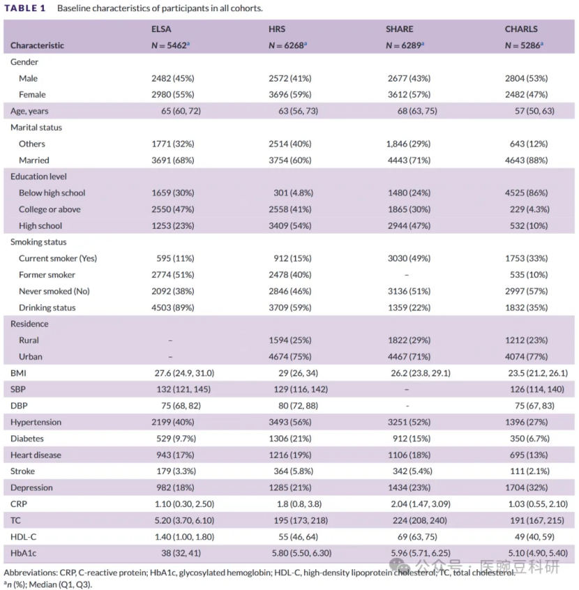 痴呆症的定义要么是自我报告的医生诊断,要么是通过结合认知和功能评估的经过验证的算法标准来定义的。痴呆症的发生是通过以下问题来评估的:“医生是否告诉过你你患有痴呆症、衰老或任何其他严重的记忆障碍?”对于ELSA和HRS;医生是否告诉过您患有阿尔茨海默病、痴呆症或其他严重的记忆障碍?“对于SHARE。在HRS中,痴呆由认知汇总评分(0-27)定义,评分≤6表示痴呆;该汇总评分涵盖了记忆和执行功能领域。在ELSA、SHARE和CHARLS中,痴呆被定义为认知障碍和功能依赖的同时发生。认知障碍被定义为在任何认知领域得分低于教育分层人群平均值≥1.5 SD。功能障碍被定义为自我报告的至少一项日常生活活动困难,包括洗澡、吃饭、穿衣、转移或在房间里走动。因为确定结合了算法阈值和自我/代理报告而不是临床裁决,所以我们将结果称为“可能的痴呆/probable dementia”(“痴呆”在下文中表示可能的痴呆)。5. 协变量本研究收集了以下协变量。(I)人口统计数据:年龄、性别(“男性”、“女性”)、婚姻状况(“已婚”、“其他”)、教育程度(“大专以上”、“高中”、“高中以下”)、居住地(“农村”、“城市”);(II)生活方式信息:吸烟状况(“当前吸烟者”、“以前吸烟者”、“从不吸烟”);饮酒状况;(III)体格检查:收缩压(SBP)、舒张压(DBP)、体重指数(BMI);和(IV)既往病史:抑郁症、高血压、糖尿病、心脏病、中风;㈤实验室检查:C反应蛋白(CRP)、糖化血红蛋白(HbA1c)、总胆固醇(TC)、高密度脂蛋白胆固醇(HDL-C)。所有合并症均根据参与者提供的自我报告病史进行定义。6. 统计分析我们采用描述性统计来总结研究参与者的基线特征。正态分布的连续变量表示为平均值±SD,非正态分布的连续变量表示为中位数(四分位数间距[IQR])。分类变量以计数(N)和百分比(%)表示。采用单变量和多变量Cox比例风险回归模型研究抑郁症状与痴呆发病率的关系,用风险比(HR)和95%置信区间(95%CI)表示,并对模型中的相关变量进行调整。估计了四个模型:模型1没有调整变量;模型2根据年龄、性别、婚姻状况、教育水平和居住地进行了调整;模型3针对模型2中的变量和吸烟状况、饮酒状况、CRP、HbA1c、TC和HDL-C进行了调整;模型4针对模型3和高血压、糖尿病、心脏病和中风中的变量进行了调整。CumDS和CumADS作为连续变量和基于四分位数的分类变量包含在每个模型中。类似地,累积负荷、暴露持续时间、斜率和时程模式也被纳入其中。使用每个四分位数中的中位CumDS、CumADS和暴露持续时间计算趋势的p值。我们基于四个调整后的Cox回归模型建立了限制性立方样条(RCS)模型,遵循模型选择的贝叶斯信息标准,以探索CumADS与痴呆发病率的潜在非线性关联。对于每个参与者,我们使用每个波记录的年龄来计算随访时间。对于具有三个波的队列,CumDS和CumADS计算为配对访视平均值的时间加权和;Cox模型的随访时间为事件/删失年龄减去基线年龄(延迟入组使用基线年龄)。多重插补通过模板方法(R包“VIM”)和多重插值方法(R包“mice”)实现。此外,还进行了亚组分析,以研究CumADS和痴呆之间的关系是否根据协变量的状态(年龄、性别、婚姻状况、教育水平、吸烟状况、饮酒状况、高血压、糖尿病、心脏病、中风)而变化。为了帮助解释在某些队列特异性四分位数比较中观察到的极端相对危害,我们生成了按队列特异性累积抑郁症状四分位数分层的KaplanMeier(KM)生存曲线。使用survfit函数(R包“生存”)估计KM曲线,并使用对数秩检验在四分位数之间进行比较。当极端相对估计值可能反映暴露分布中的稀疏事件时,这些描述性KM分析通过呈现绝对事件概率和促进解释来补充Cox模型HR估计值。为了减少前驱期痴呆反向因果关系的可能性,我们进行了补充滞后分析。具体来说,我们排除了在第二个研究波(即,在第一个波间间隔内,队列中≈2年)新分类为痴呆的参与者,重新估计了剩余风险样本中的主要Cox比例风险模型,并将滞后分析的结果与主要估计进行了比较,以评估早期事件病例的影响以及我们的发现对潜在前驱效应的稳健性。最后,在每个队列中,我们进行了完全病例逻辑回归敏感性分析,以评估我们发现的稳健性。为了解决抑郁工具和评分范围的差异,我们使用每个队列中的z标准化抑郁症状评分进行了敏感性分析(每个评分以均值为中心,除以队列标准差;z=(x均值)/SD)。所有统计分析均在R(版本4.4.2)中进行。双侧p值<0.05被认为具有统计学意义。亮点三:清晰呈现研究结果1. 参与者特征表1总结了四个队列中23,305名参与者的基线特征:ELSA为5462名,HRS为6268名,SHARE为6289名,CHARLS为5286名。ELSA的中位基线年龄为65.0岁(IQR 60.072.0),HRS为63.0岁(IQR 56.0-73.0),SHARE为68.0岁(IQR 63.0-75.0),CHARLS为57.0岁(IQR 50.0-63.0)。不同队列的教育程度存在显著差异:47.0%的ELSA、41.0%的HRS、30.0%的SHARE和4.3%的CHARLS报告了大学或更高的教育程度。健康行为和居住模式因队列而异。ELSA目前的吸烟率为11.0%,HRS为15.0%,SHARE为49.0%,CHARLS为33.0%;ELSA的酒精使用患病率从22.0%到89.0%不等。HRS的中位BMI最高(29.0 kg/m2,IQR 26.0-34.0),CHARLS的中位BMI最低(23.5 kg/m2,IQR 21.2-26.1)。心血管和代谢共病特征也不同:高血压患病率从CHARLS的27.0%到HRS的56.0%不等;ELSA的糖尿病患病率为9.7%,HRS为21.0%,SHARE为15.0%,CHARLS为6.7%。各队列的心脏病患病率范围为17.0%至19.0%,而卒中史范围为2.1%至5.8%。由队列特异性CES