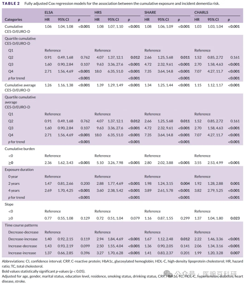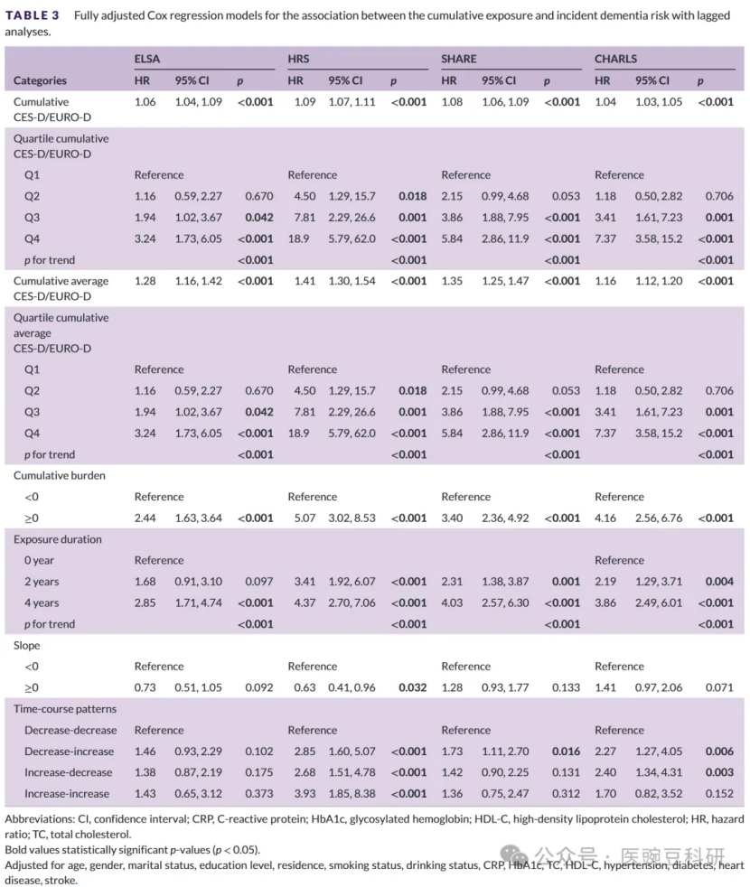 4. 滞后分析为了降低前驱期痴呆解释我们发现的可能性,我们在排除了第二波研究中新分类为痴呆的参与者后,重新运行了完全调整的Cox模型(表3)。保留了主要关联(表S5-S8)。累积抑郁症状的单位相关性仍然显著,并且与主要分析的幅度相似:ELSA HR 1.06(95%CI 1.04-1.09),HRS HR 1.09(95%CI 1.071.11),SHARE HR 1.08(95%CI 1.06-1.09)和CHARLS HR 1.04(95%CI 1.03-1.05)(所有p<0.001)。在滞后样本中,极端负荷(Q4与Q1)的比较仍然较高(ELSA HR 3.24【1.73-6.05】;HRS HR 18.9【5.79-62.0】;SHARE HR 5.84【2.8611.9】;CHARLS HR 7.37【3.58-15.2】;所有p<0.001),累积负担(≥0 vs<0)继续在队列中赋予显著更高的风险(ELSA 2.44【1.63-3.64】;HRS 5.07【3.02-8.53】;SHARE 3.40【2.36-4.92】;CHARLS 4.16【2.56-6.76】;所有p<0.001)。持续的高症状暴露(4年对0年)再次显示出稳健的风险增加(ELSA 2.85【1.71-4.74】;HRS 4.37【2.70-7.06】;份额4.03【2.57-6.30】;CHARLS 3.86【2.49-6.01】;所有p<0.001)。轨迹分析产生了可比的结果:涉及症状增加的模式(例如,HRS增加-增加HR 3.93【1.85-8.38】;HR下降-增加2.85【1.60-5.07】)仍然与痴呆密切相关。值得注意的是,症状进展斜率的估计值变化不大:HRS中先前不显著的斜率在滞后分析中变得具有统计学意义(斜率≥0:HR 0.63,95%CI 0.41-0.96,p=0.032),而其他队列中的斜率效应没有变化或处于临界水平。总体而言,排除早期事件病例并没有实质性减弱相关性,表明我们的主要发现不太可能仅仅是由前驱抑郁症驱动的。