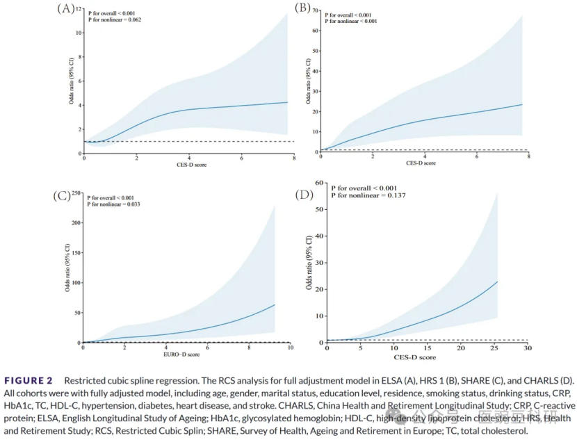 按累积抑郁症状四分位数分层的KM曲线如图S1-S4所示。这些基于KM的绝对估计表明,随着时间的推移,最高累积抑郁四分位数、时程模式和暴露持续时间的参与者经历了更高的绝对痴呆发病率,并有助于将大的相对危害(例如,HR≈18,以小时为单位)置于背景中,这主要反映了极端暴露阶层中极少数参与者/事件。考虑死亡的竞争性风险分析结果在方向上是一致的。在所有四个队列中,CumADS的RCS建模显示,在完全调整的模型中,与痴呆事件存在一致的强、正的剂量反应相关性。在ELSA和CHARLS(图2A,D)中,样条曲线以接近线性的方式上升(p-overall<0.001;p-非线性分别为0.062和0.137),表明CumADS中的每一个额外点都会稳步增加痴呆风险,而没有安全阈值的证据。相比之下,HRS表现出明显的J形模式(p-overall<0.001;p-非线性<0.001),痴呆几率在急剧上升之前在低CumADS评分下保持平稳(图2B)。SHARE的EURO-D样条处于中间位置:风险几乎线性增加,直到CumADS大约等于6(图2C),然后在更高的分数下加速得更快(p-overall<0.001;p-非线性=0.033)。在所有数据集中,即使CumADS的适度升高也与痴呆风险增加相关,这强调了识别和减轻整个暴露范围内抑郁症状的公共卫生必要性。
