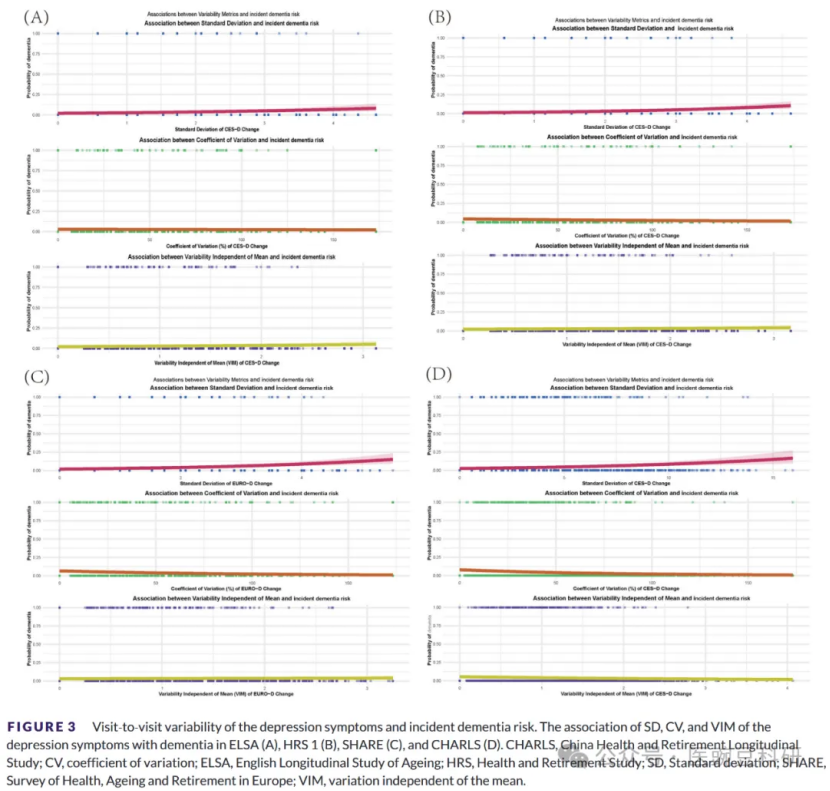 在四个纵向队列(ELSA、HRS、SHARE和CHARLS)中,通过访视特异性SD、CV和VIM量化的抑郁症状的参与者内变异性在个体之间存在显著差异。一些参与者表现出围绕其个人平均值的分数紧密聚类(低SD和CV),而另一些参与者表现出明显的分散(高SD和CV)。每个队列的散点图分析显示了正的线性趋势:较高的SD值对应于预测的痴呆风险的增量增加,CV的模式类似。这些发现表明,随着时间的推移,抑郁症状中更大的绝对SD和相对CV波动与痴呆风险升高适度但一致地相关。在采用VIM的敏感性分析中,VIM和痴呆之间的关联反映了SD和CV观察到的关联。因此,VIM分析加强了SD和CV的发现,提供了强有力的证据表明抑郁症状轨迹的可变性与痴呆风险增加相关(图3A-D)。总的来说,这些结果强调了评估抑郁症状作为痴呆独立预测因子的访视间变异性的重要性。